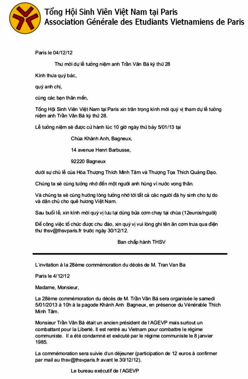 Am 05.01.2013 lud die Vietnamesische Studentenvereinigung von Paris (Tổng Hội Sinh Viên Việt Nam tại Paris) in den Khánh Anh Tempel im französischen Bagneux ein, um, wie jedes Jahr, an Trần Văn Bá zu erinnern und für seine Seele zu beten.